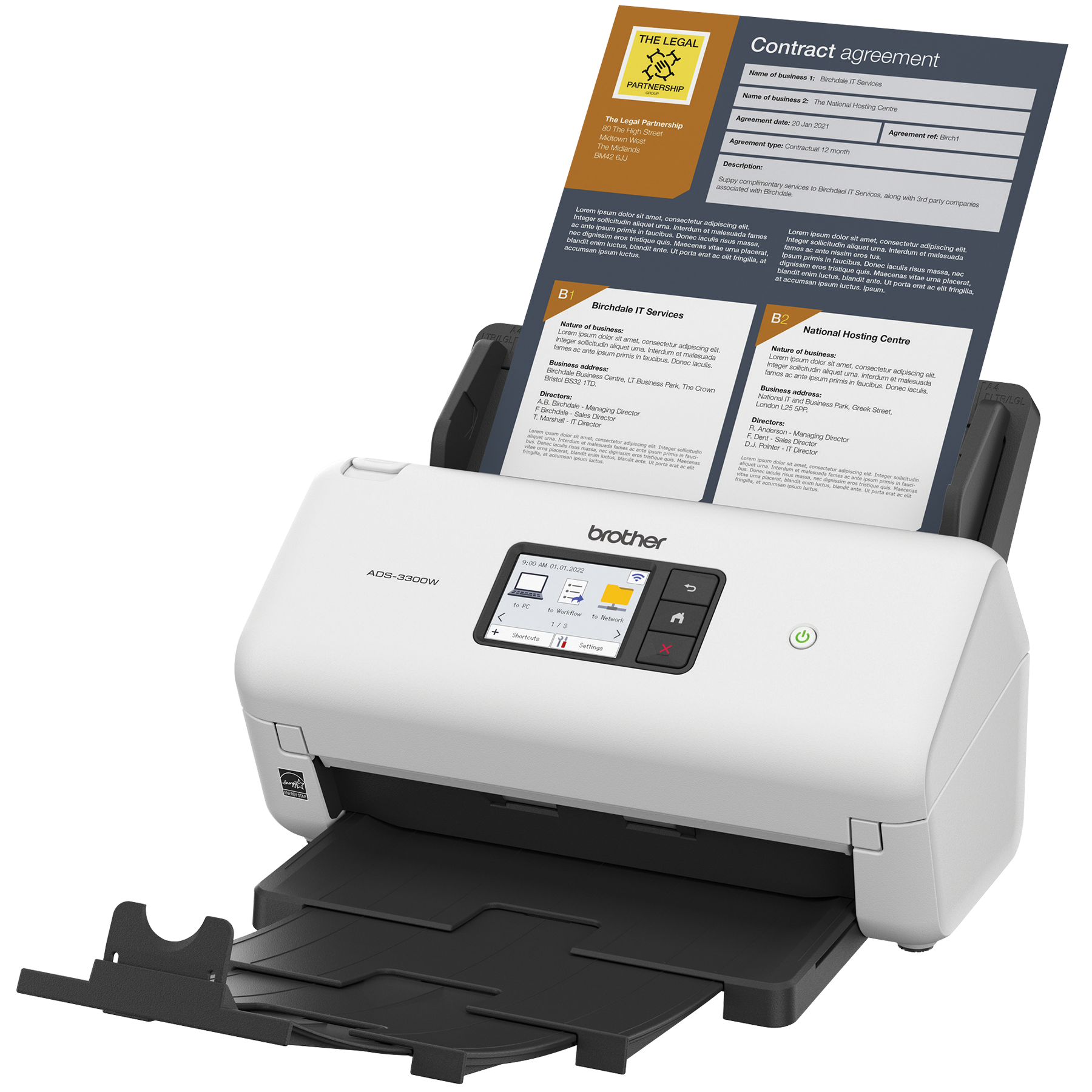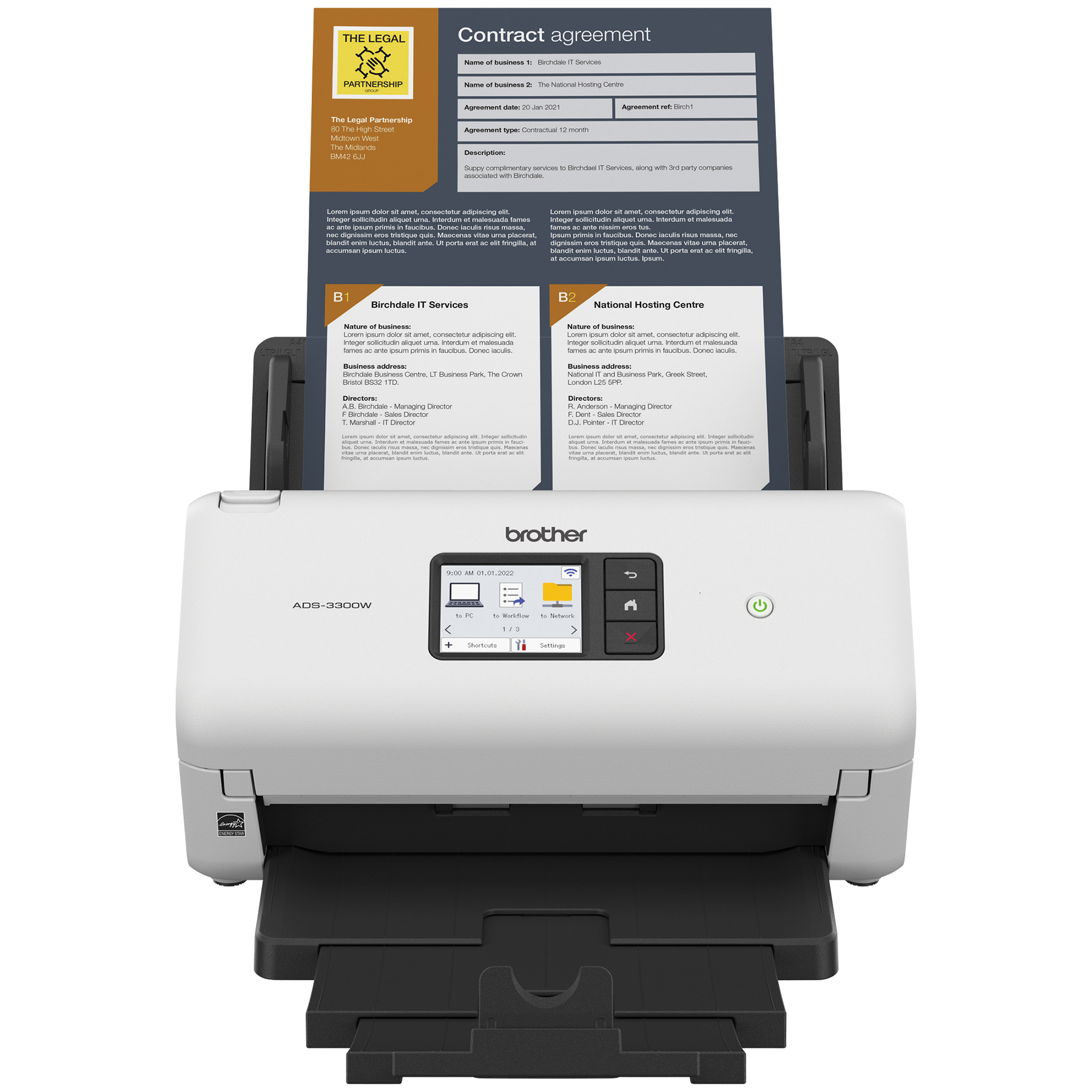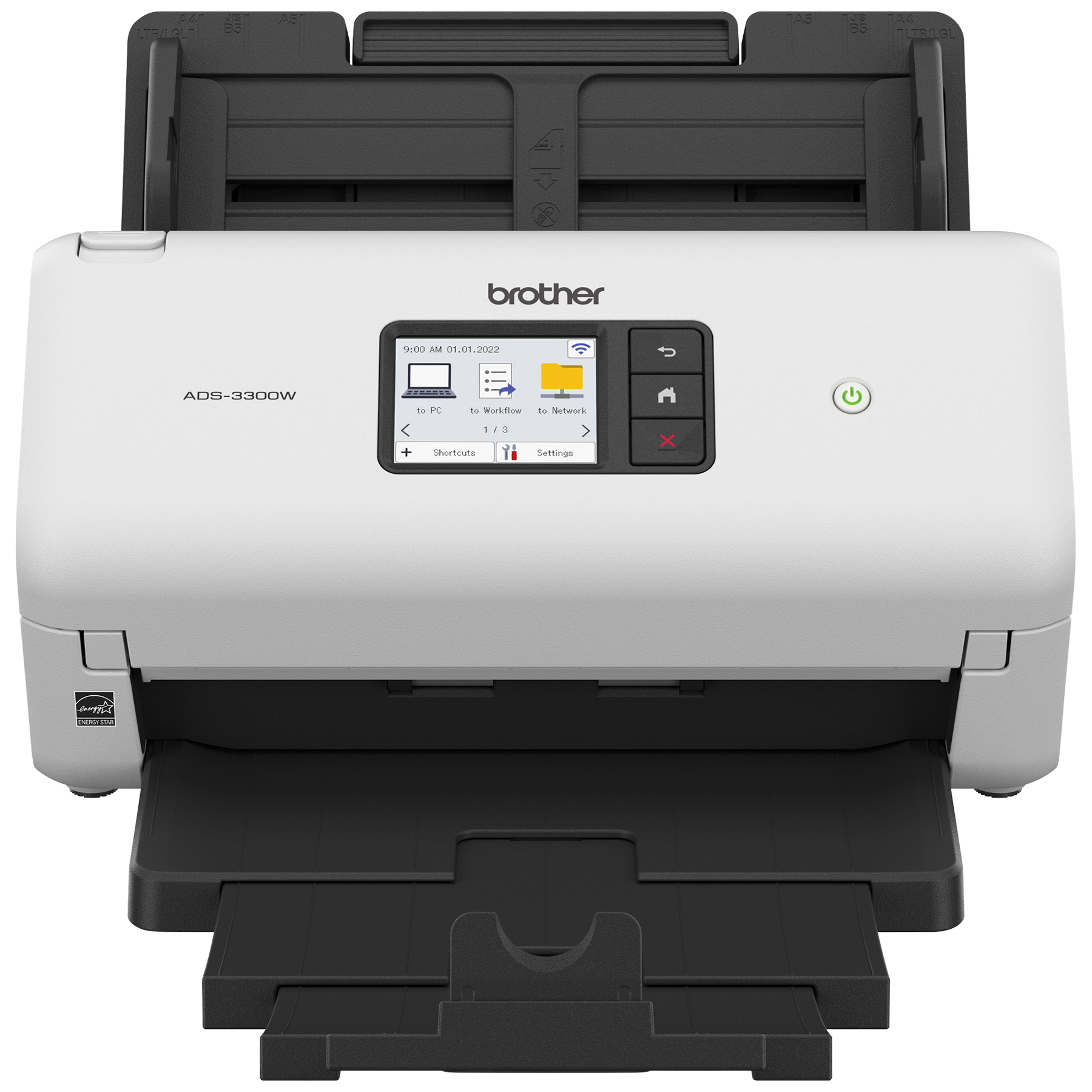 Small but mighty, the easy to use, affordable and efficient Brother ADS-3300W is a powerful addition to any small business or home office workspace. A versatile and reliable solution for mid-volume scanning, it scans to multiple destinations (cloud services, SharePoint, USB memory stick, email, file, image, OCR or to mobile devices), and offers a range of connectivity options including wireless/wired fast Ethernet network connectivity, or via the Brother Mobile Connect2 app for iOS and Android . Engineered for exceptional ease of use with a 2.8-inch colour touchscreen, the ADS-3300W performs single or dual-sided document scanning, with an impressive capacity of up to 60 sheets via the built-in auto document feeder with additional page-continuous scanning. Spend less time waiting and more time scanning! With a speed of up to 40 ppm, it quickly handles a wide variety of media types and paper sizes, including legal-size and long paper, business and plastic ID cards, receipts, and even photos. Bid farewell to frustration and remove the guesswork from scanning with its built-in auto-size detection. Seamlessly transition from scanning smaller items like business cards to longer documents like legal contracts at the touch of a button. Thanks to its compact size, users can say bye-bye to big and bulky equipment and hello to an organized, efficient workspace in practically any surrounding. From gathering banking statements to indexing client invoices and tracking expenses, this desktop scanner includes a robust software bundle valued at over $250 that elevates performance, drives value, and puts the pro in professional-level organization. This dynamic scanner is ready to go right out of the box! It s compatible with several document management software systems, Windows, Mac and Linux operating systems, as well as TWAIN, WIA for PC, ICA for MAC, and SANE drivers.