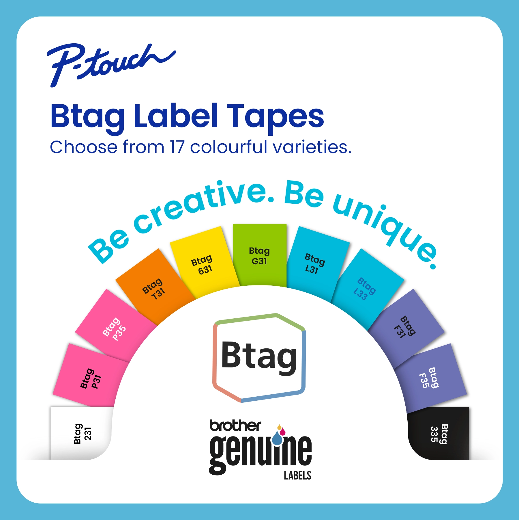 Brother's latest collection of P-touch label makers is designed for exclusive use with Genuine Btag 12 mm label tapes. Available in a kaleidoscope of 17 colourful varieties, there’s always a label to match your mood, your room, or your personal belongings.