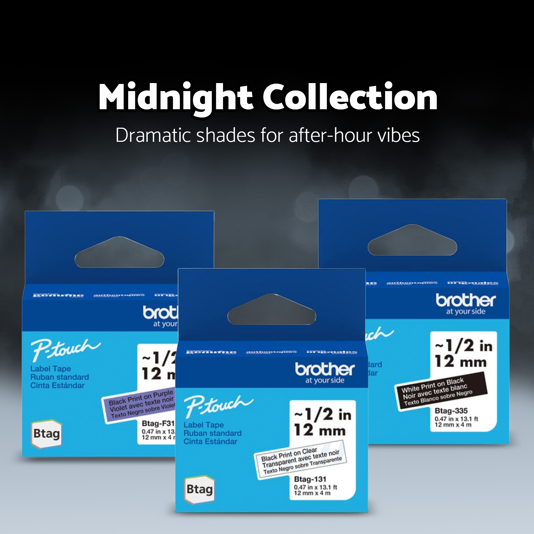 Take your projects to the dark side with the dramatic shades of the Midnight collection. The 3-pack includes 1 of each of the following label tapes: BTAG131 Black on Clear, BTAG335 White on Black, BTAGF31 Black on Purple.