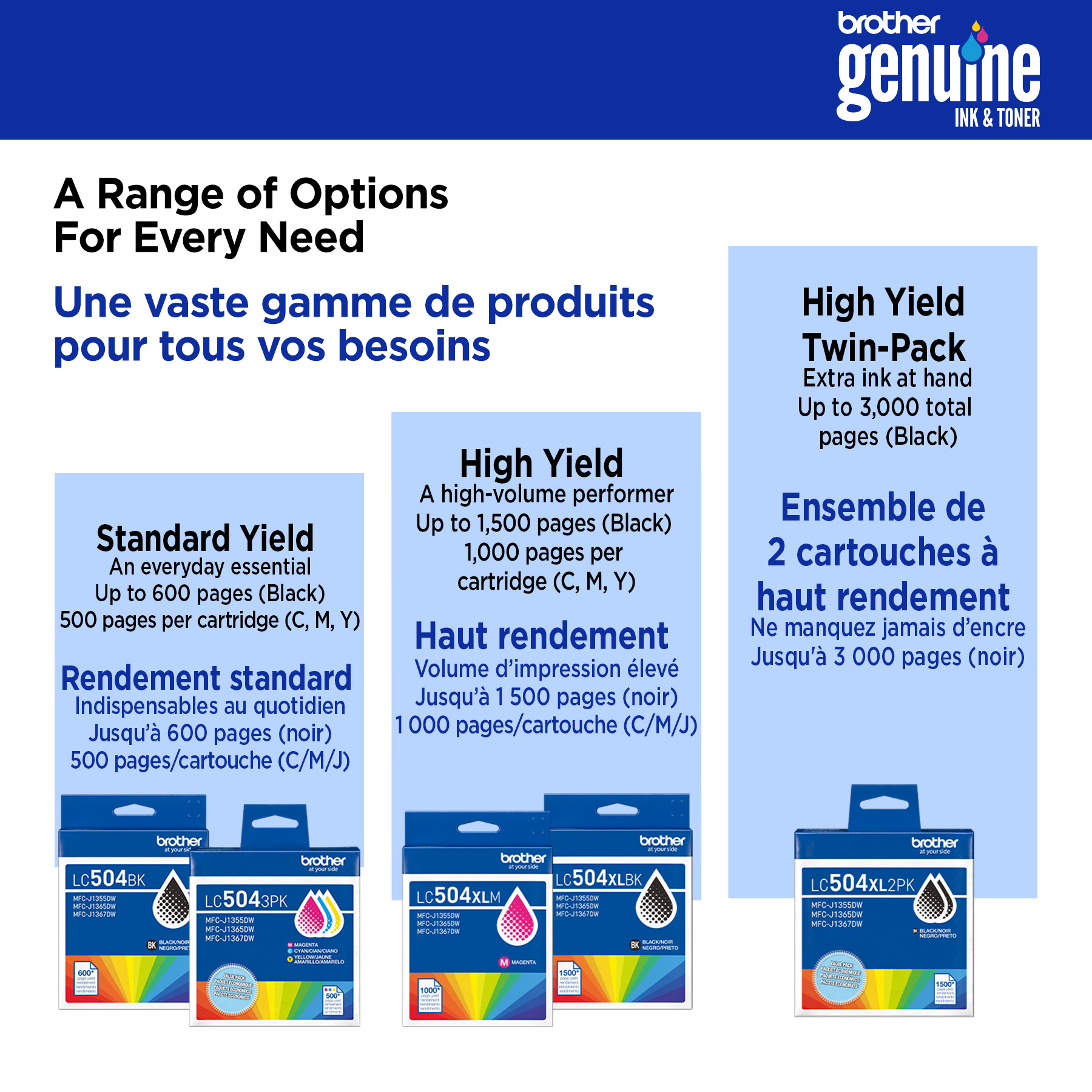 - Print confidently. Brother Genuine LC504XL2PKS Twin Pack High Yield Black Ink Cartridges deliver consistent, reliable performance.
