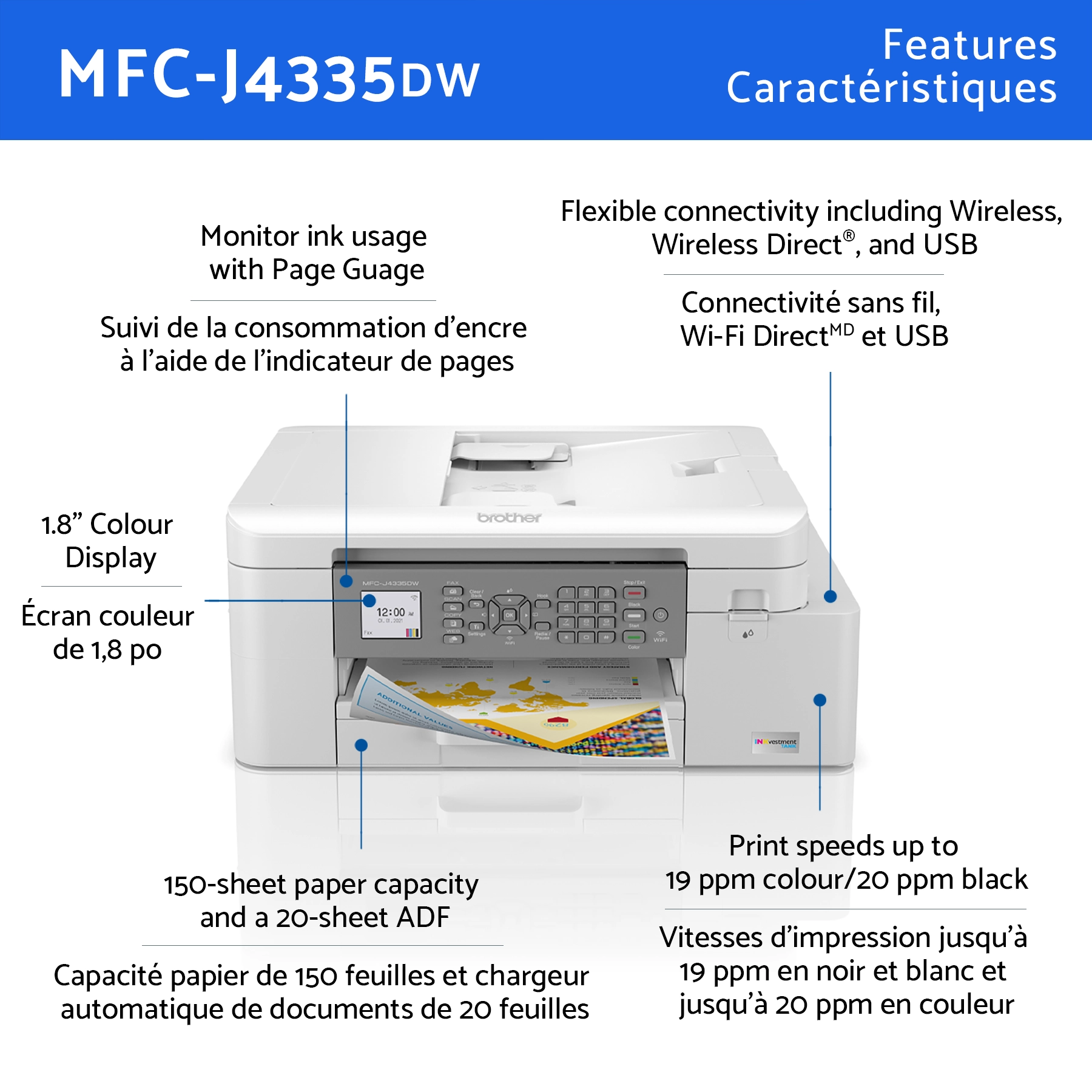 The MFC-J4335DW is perfect for everything from school projects to at-home and office printing needs. The enhanced colour graphics, reengineered ink for both colour and black-and-white printing, and ADF paper feeder deliver crisp, vivid outputs, making it a great choice for printing photos and colour documents.