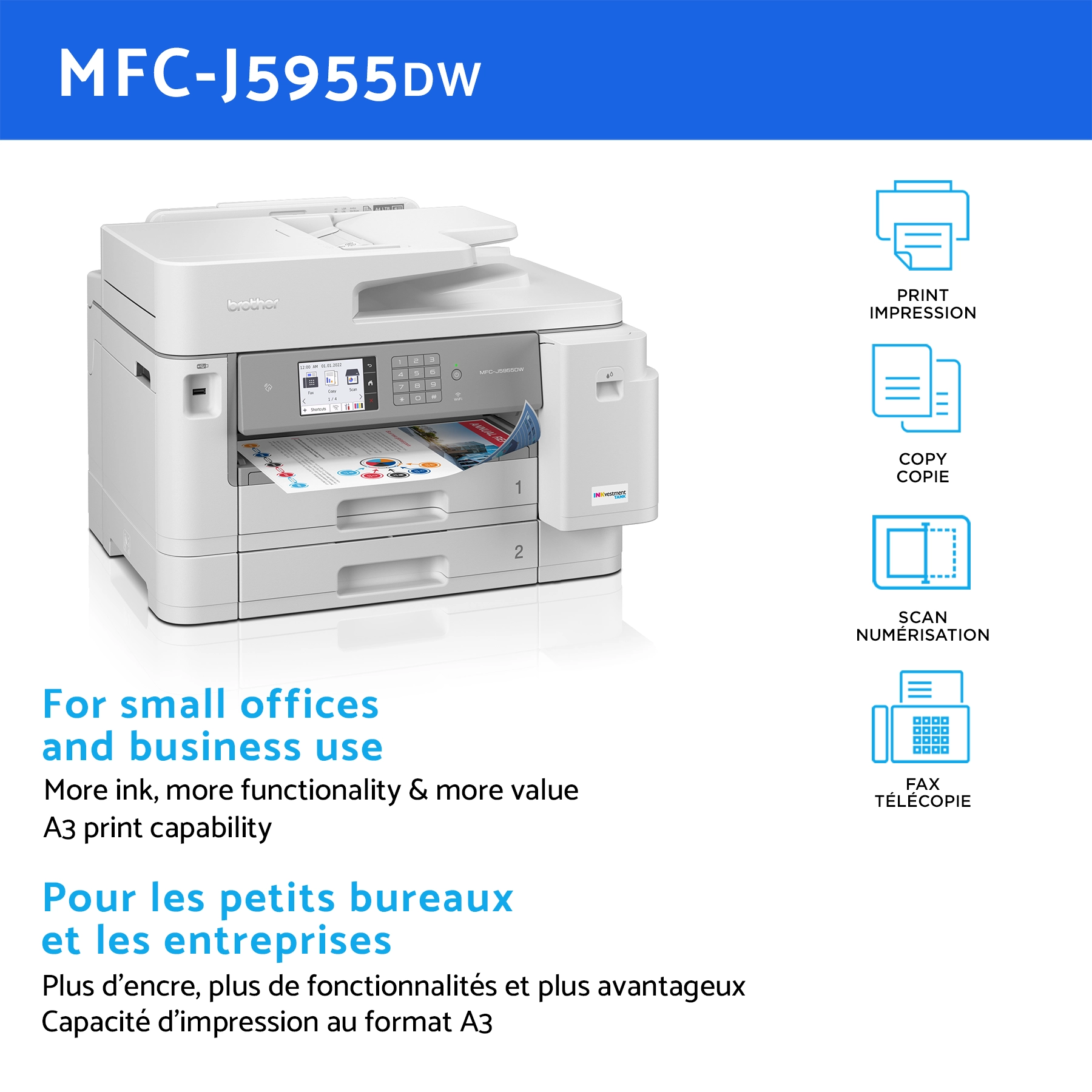When it comes to more, the Brother INKvestment Tank MFC-J5955DW all-in-one business colour inkjet printer doesn’t hold back. With up to 1 year of in-box ink, this A3 printer offers powerful business functionality and delivers fast, high-quality, low-cost colour printing at up to 30 pages per minute with our patented MAXIDRIVE printing technology. Advanced workflow features and triple-layer security help safeguard sensitive documents and securely connect to the device and network. As for versatile paper handling, you can print up to 11” x 17" (ledger) size from two 250-sheet trays. Or use the 100-sheet multipurpose tray for envelopes, cardstock and more or the 50-page auto document feeder to copy, scan, or fax up to 8.5” x 11”. Enjoy flexible connectivity such as built-in dual-band wireless (2.4GHz/5GHz), Wi-Fi Direct, Ethernet, or connect to a single computer through a USB cable. It even works with Amazon Alexa. What’s more, print, copy, scan, and fax functions are easy to manage from a computer, mobile device, or using the intuitive 3.5” LCD colour touchscreen. You’ll love the eco-friendly features like EPEAT® and ENERGY STAR® certification, Eco Mode and Ink Save Mode that help reduce power and ink use. And while you’re helping the planet, default duplex printing saves paper, and as a bonus, saves you money, too. Now that’s what we call “more.”