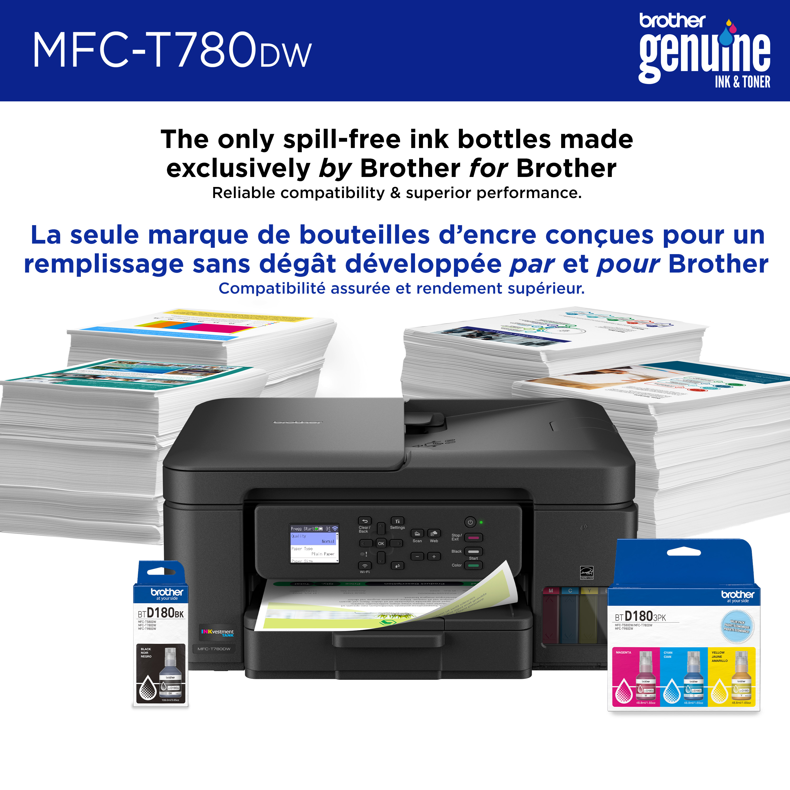 - Brother Genuine Ink. For reliable performance you can count on, Brother Genuine Ink is quality-tested to work seamlessly with your Brother printer. Choose Brother Genuine BTD180 Ink bottles – the only brand we recommend for use with your printer.