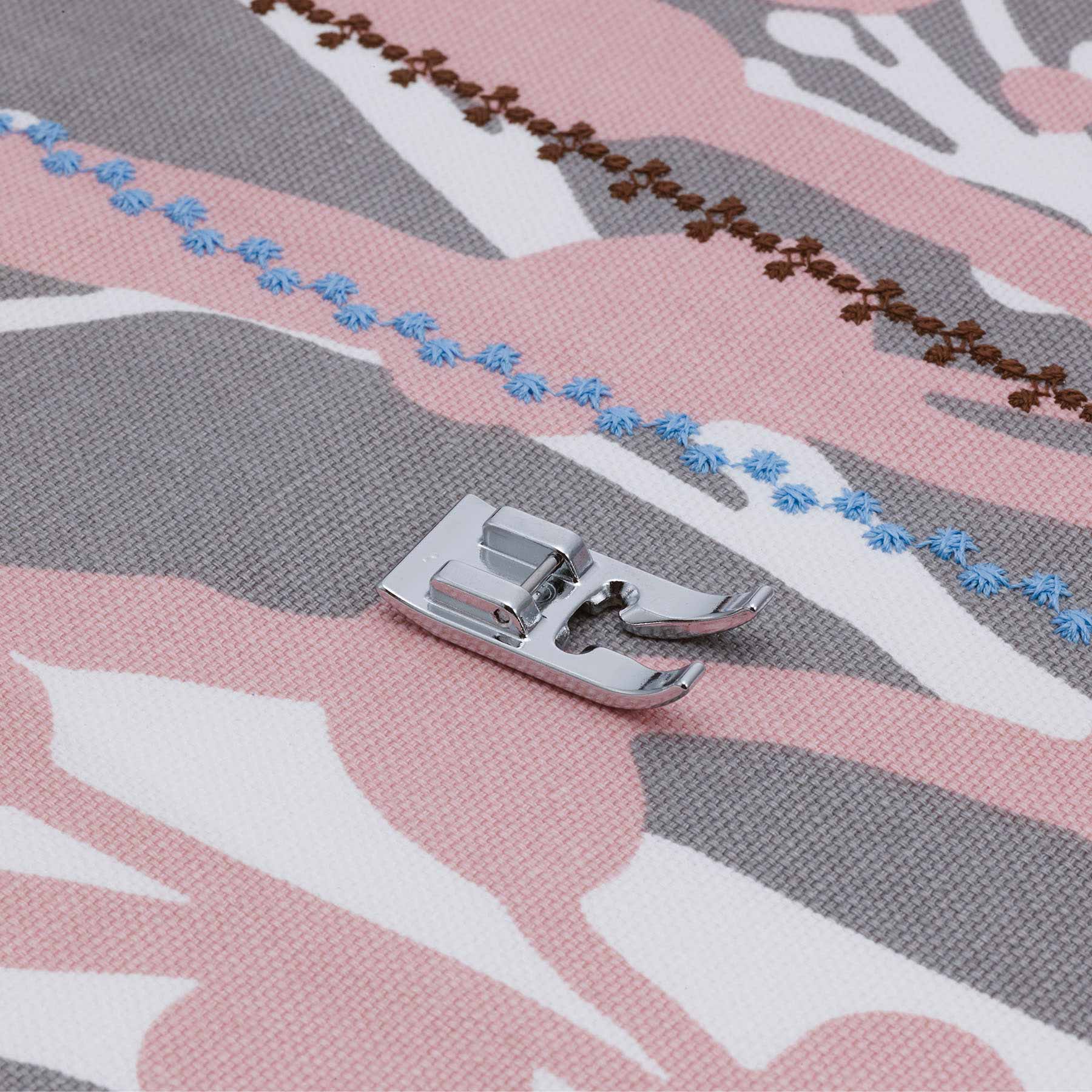 Add a beautiful, decorative touch resembling handsewn knotted candlewicking to embellish pillows, table linens, bed linens, and clothing, or to stitch down appliqué shapes or ribbons. This candlewicking foot has a specially formed, deep tunnel on the underside, which allows the raised candlewicking stitches to pass under the foot easily, and helps prevent unwanted pressure on your finished stitches. Ideal not only for candlewicking stitches, but for other raised or 3-dimensional stitches, and for sewing with heavier cotton threads.