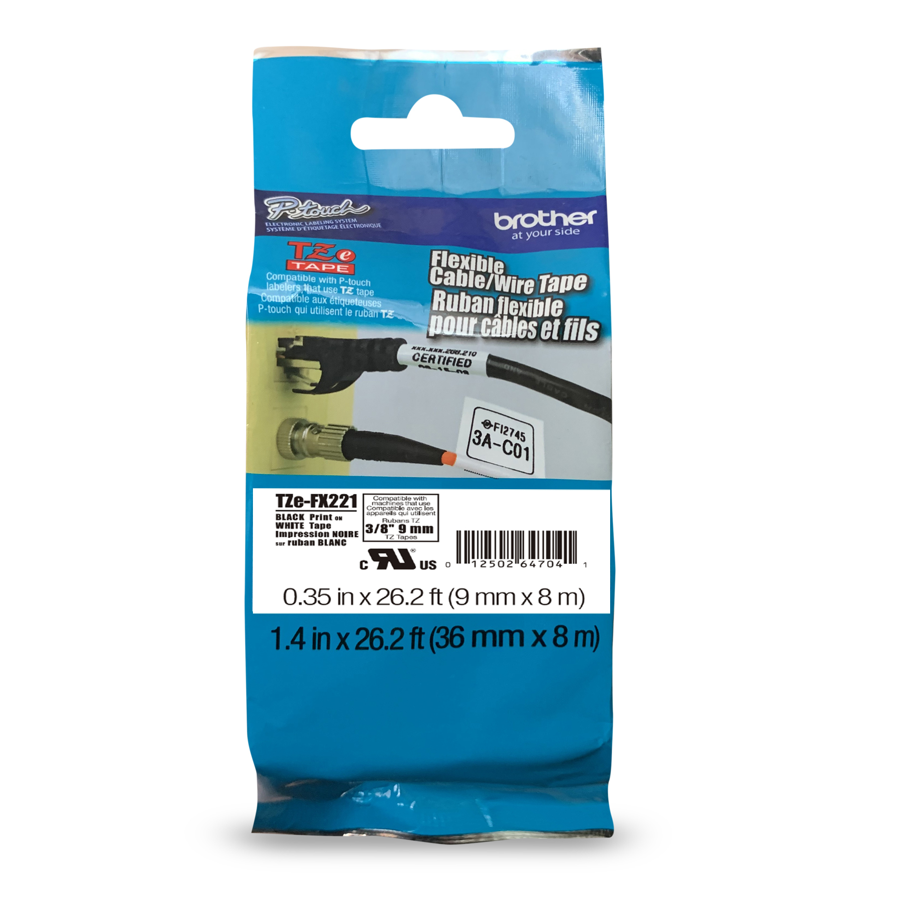 Brother Genuine TZe-FX221 black on white 9 mm flexible ID laminated tape is designed for use with P-touch label makers and is perfect for many types of labelling applications. Featuring a specially formulated adhesive designed to stick to itself, it's great for wrapping around cylindrical surfaces such as cables, wires and PVC pipes making it a great choice for wire wrapping, flagging and more.