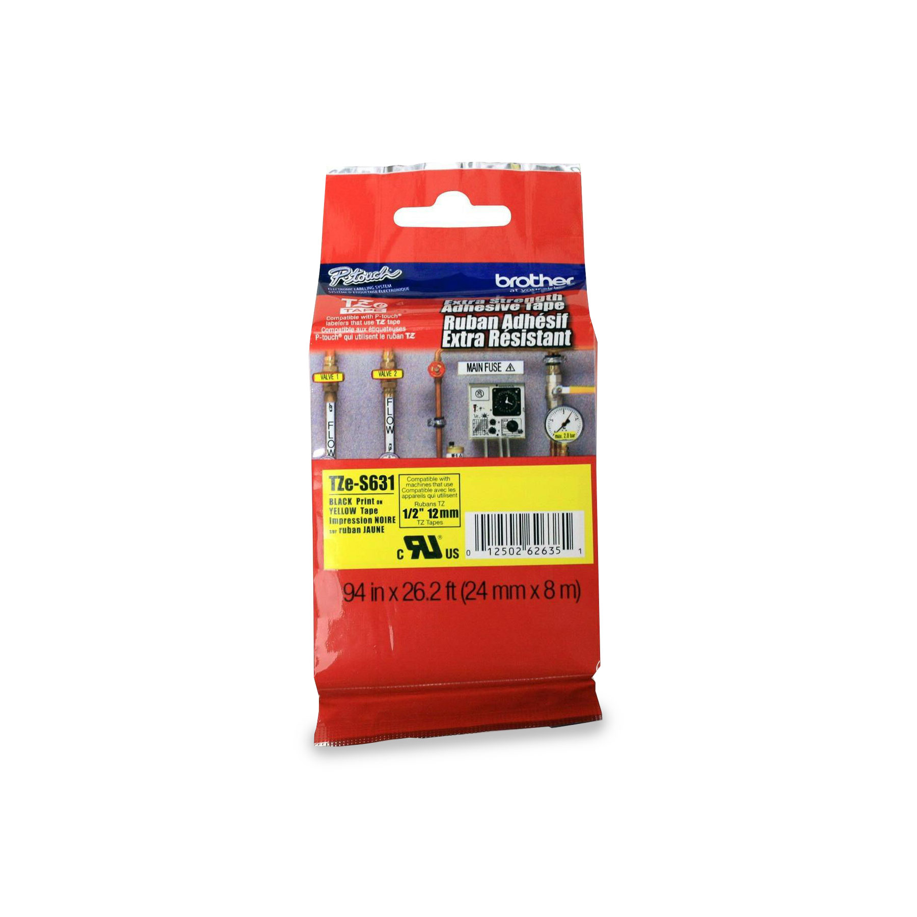 TZe-S631 P-touch black on yellow extra strength adhesive laminated tape is perfect for labelling even the toughest surfaces. Featuring Brother s exclusive laminated tape process, these extra strength adhesive labels can withstand extreme conditions both indoors and outdoors. See full product description