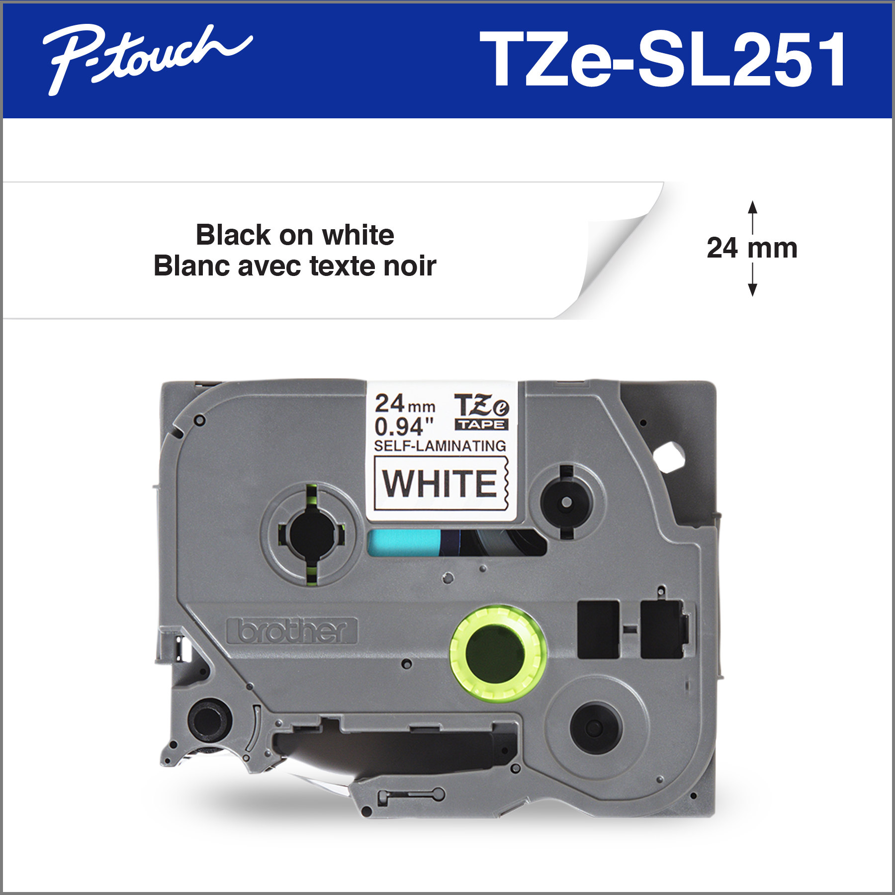 - Black on white self-laminating TZe 24 mm tape for use with Brother P-touch label makers
