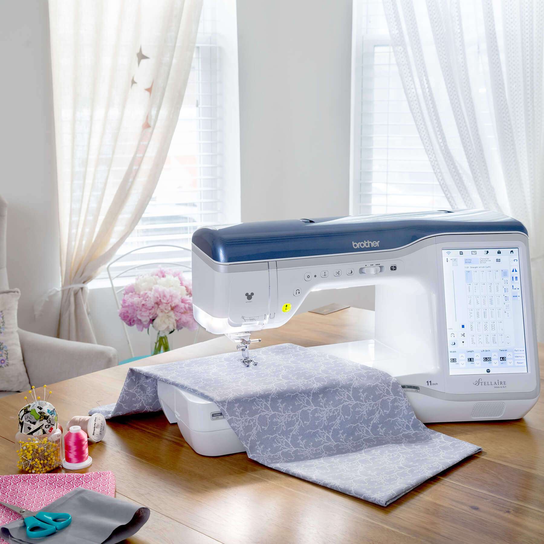 Introducing The Stellaire XJ1, Brother s newest development in cutting-edge sewing, quilting and embroidery innovation. Advanced features include a large 9.5 x 14 embroidery area for working on big designs, a 56-square inch workspace with 11 inches needle to arm that s perfect for large quilt projects and the convenient Sew Straight Laser Vision Guide that makes sewing straight lines a breeze. Featuring over 725 built-in embroidery designs and fonts and Brother s Exclusive My Design Centre, you can create unique embroidery projects for virtually endless creative possibilities. And with My Design Snap Mobile App for background scan, line art and illustration scan and precise design placement, you ll get professional results in a snap!