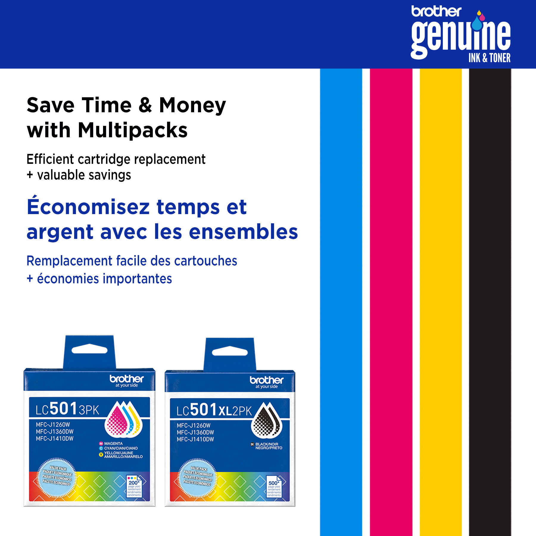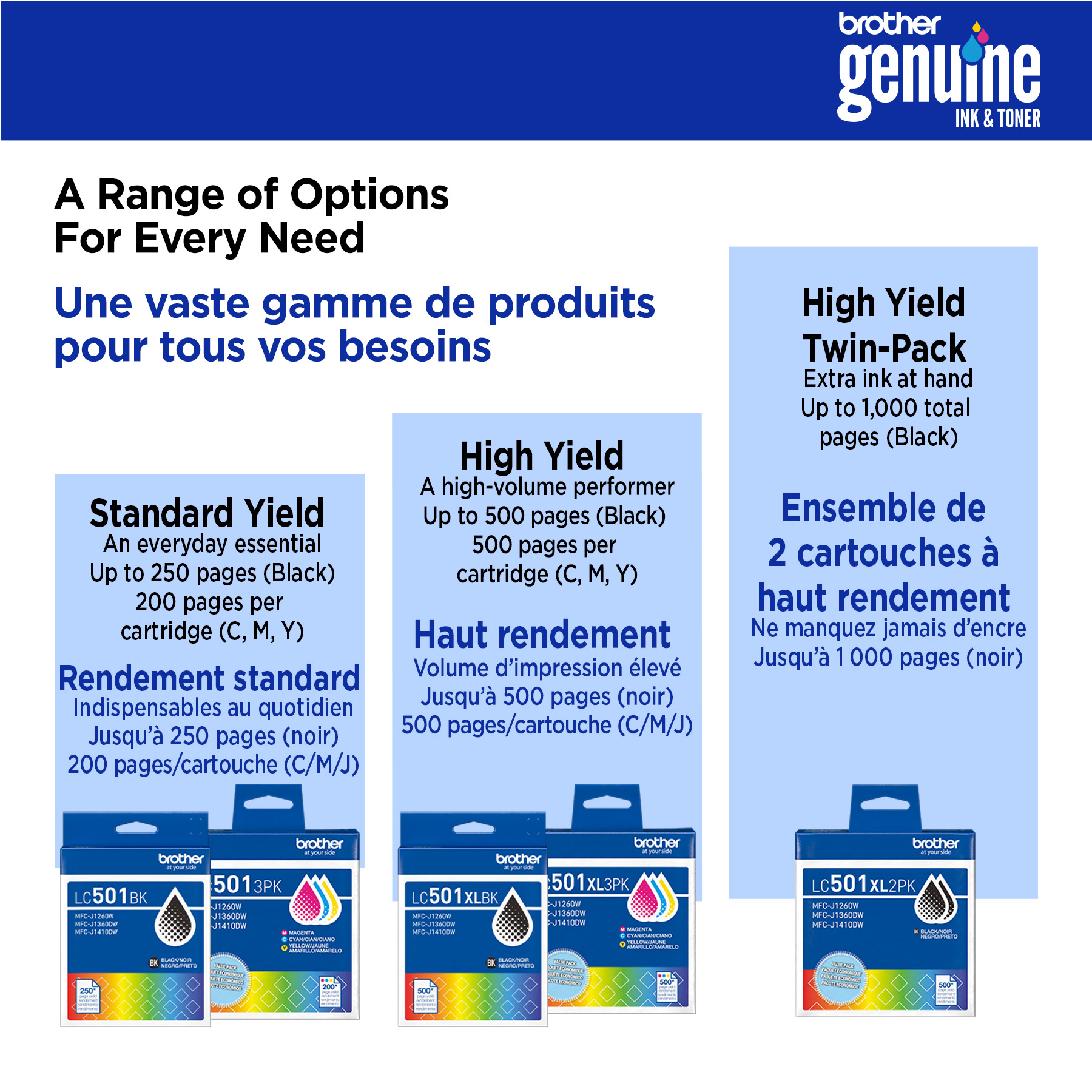 - Compatible avec l’Abonnement encre et toner Refresh. Les imprimantes compatibles avec les cartouches d’encre de la série LC501 sont admissibles à l’abonnement. Recevez des cartouches d’encre authentiques avant même d’en manquer. Visitez brother.ca/refresh.