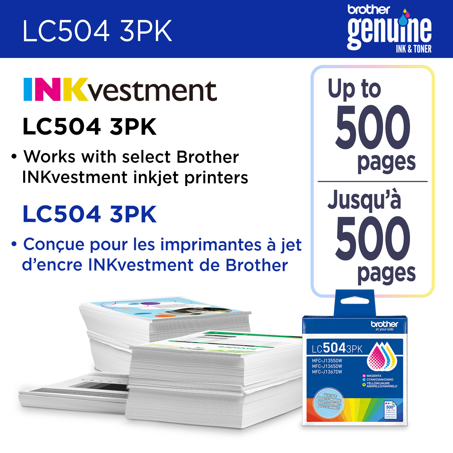 Que ce soit pour imprimer vos coupons ou rapports d’impôts, vous pouvez toujours compter sur les cartouches d’encre authentiques de Brother. L’ensemble de cartouches d’encre cyan, magenta et jaune à rendement standard LC5043PK authentique de Brother peut imprimer jusqu’à 500 pages par cartouche(1). C’est la seule marque d’encre recommandée pour votre imprimante INKvestment MFC-J1365DW de Brother.