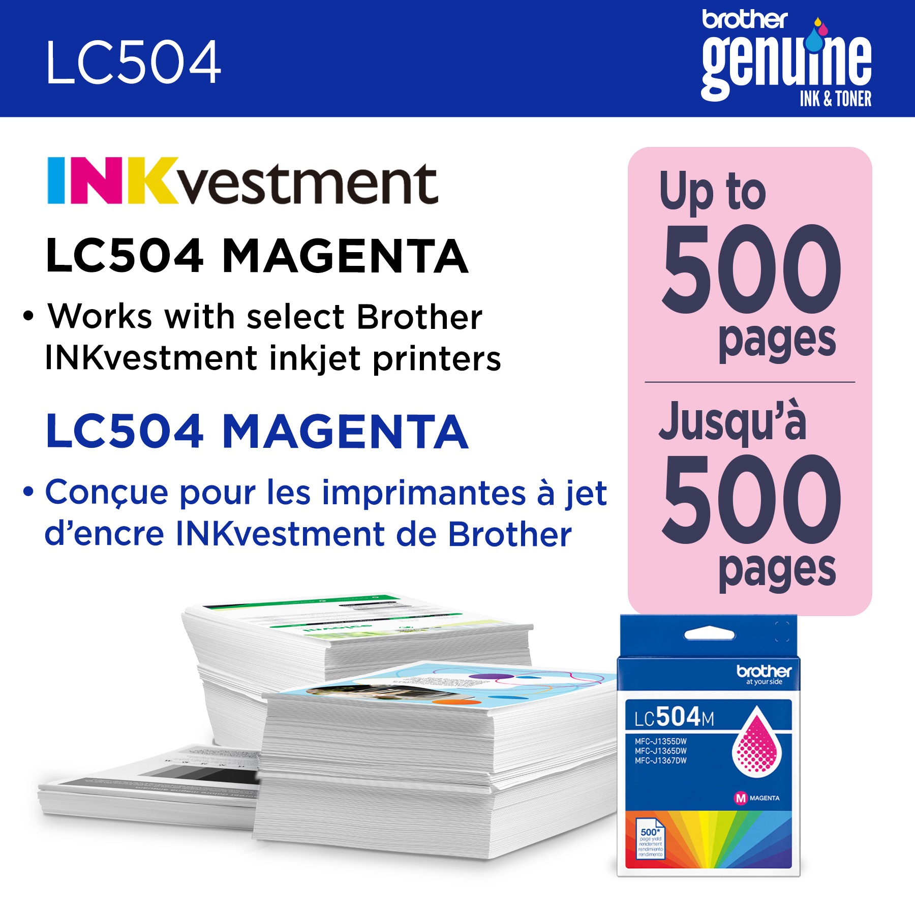 Que ce soit pour imprimer vos coupons ou rapports d’impôts, vous pouvez compter sur les cartouches d’encre authentiques de Brother. La cartouche d’encre magenta à rendement standard LC504MS produit des impressions nettes aux couleurs vives, jusqu’à 500 pages.(1) C'est la seule marque recommandée pour des résultats fiables et constants avec votre imprimante INKvestment Tank MFC-J1365DW de Brother.