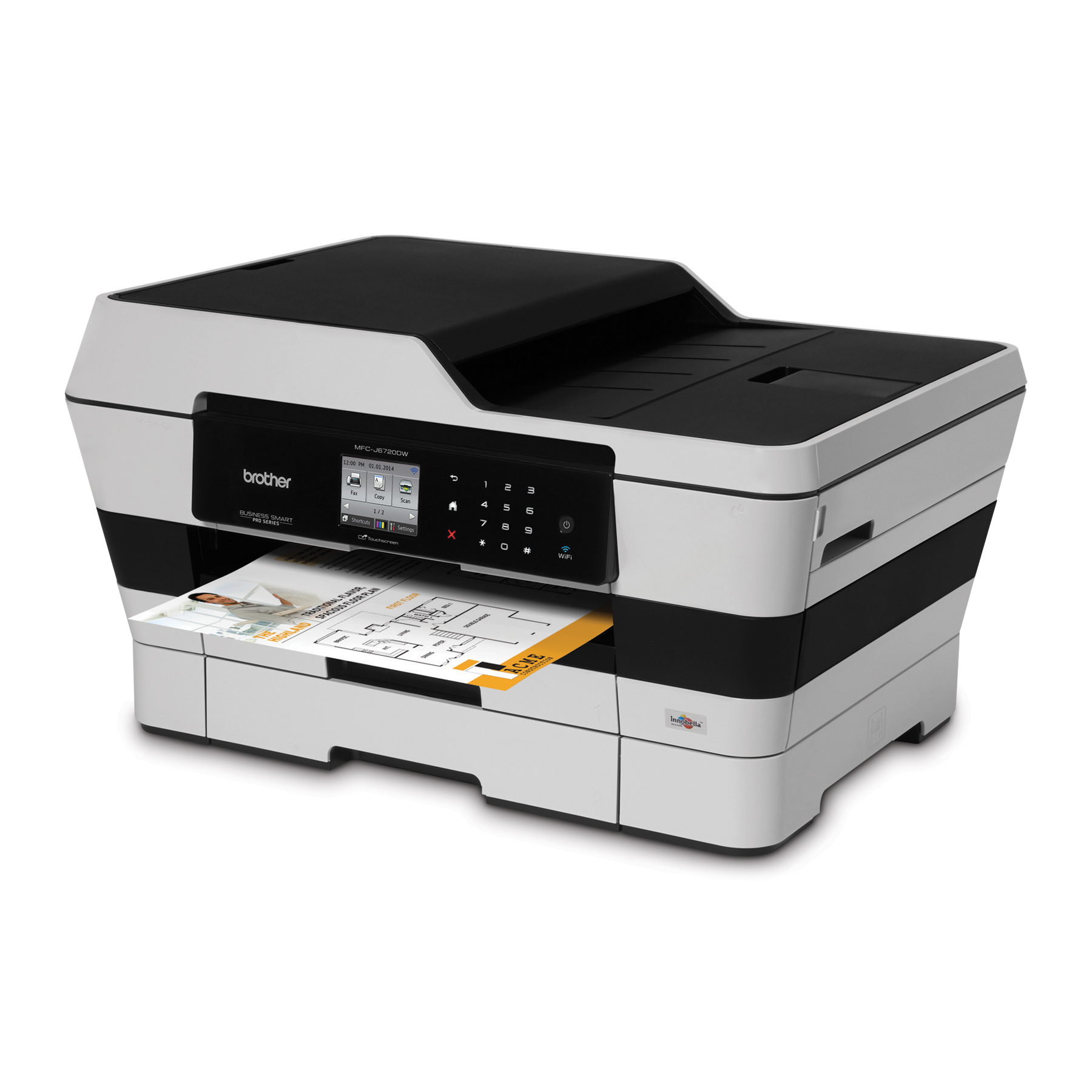 Cette imprimante multifonction à jet d'encre couleur imprime, copie, numérise et télécopie des documents jusqu'au format 11 po x 17 po. Connectez facilement votre appareil à Ethernet ou à un réseau sans fil, et imprimez ou numérisez directement à partir d'appareils mobiles compatibles. Comprend des applications infonuagiques gratuites de Brother et permet de numériser et d'imprimer à partir des sites Web les plus populaires au moyen de Web Connect et de l'écran tactile couleur intuitif de 2,7 po. L'impression recto verso intégrée aide à économiser du papier, tandis que les bacs à papier doubles pour une capacité totale de 500 feuilles et les vitesses d'impression rapides augmentent votre productivité. La technologie d'impression en mode paysage permet d'offrir un appareil de format compact et les cartouches d'encre de remplacement à très haut rendement aident à réduire les coûts d'impression. Soutien gratuit pour la durée de vie de l'appareil.