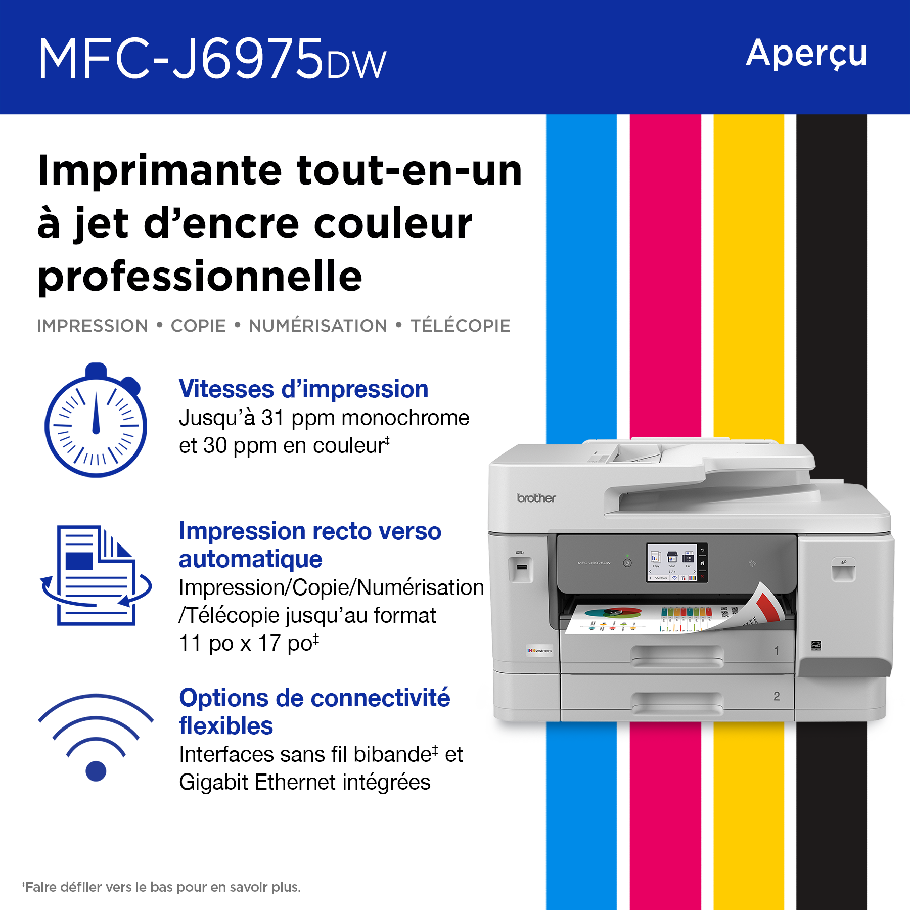 Pour en savoir plus sur le 'Brother MFC-J6975DW Imprimante tout-en-un à jet d’encre couleur professionnelle économique avec fonctions d’impression, de numérisation, de copie et de télécopie au format 11 po x 17 po et fonctions de sécurité avancées', téléchargez la brochure en cliquant ici.