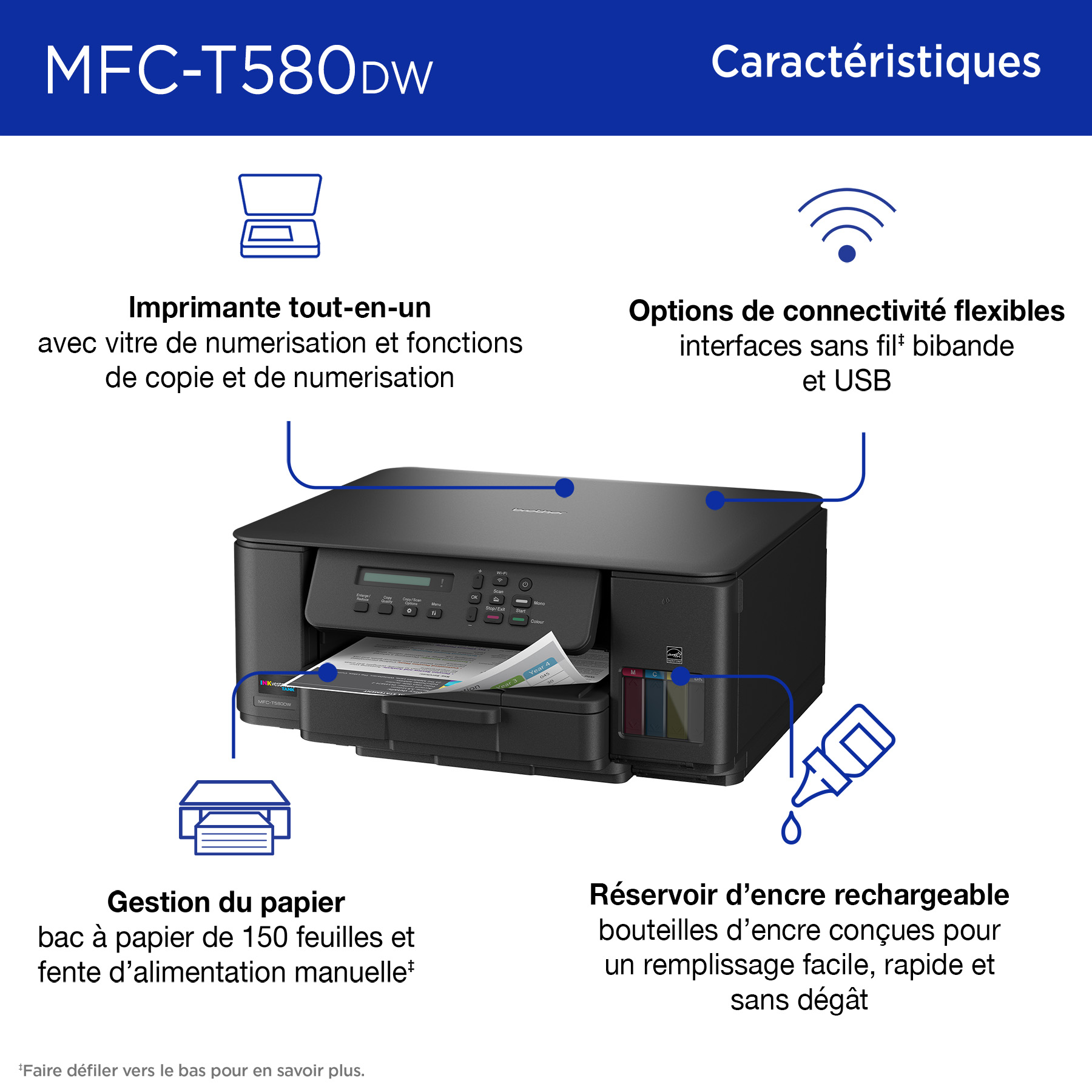 Pour en savoir plus sur le 'Brother MFC-T580DW Imprimante tout-en-un à jet d’encre couleur sans fil INKvestment Tank assortie de 3 ans d’encre', téléchargez la brochure en cliquant ici.
