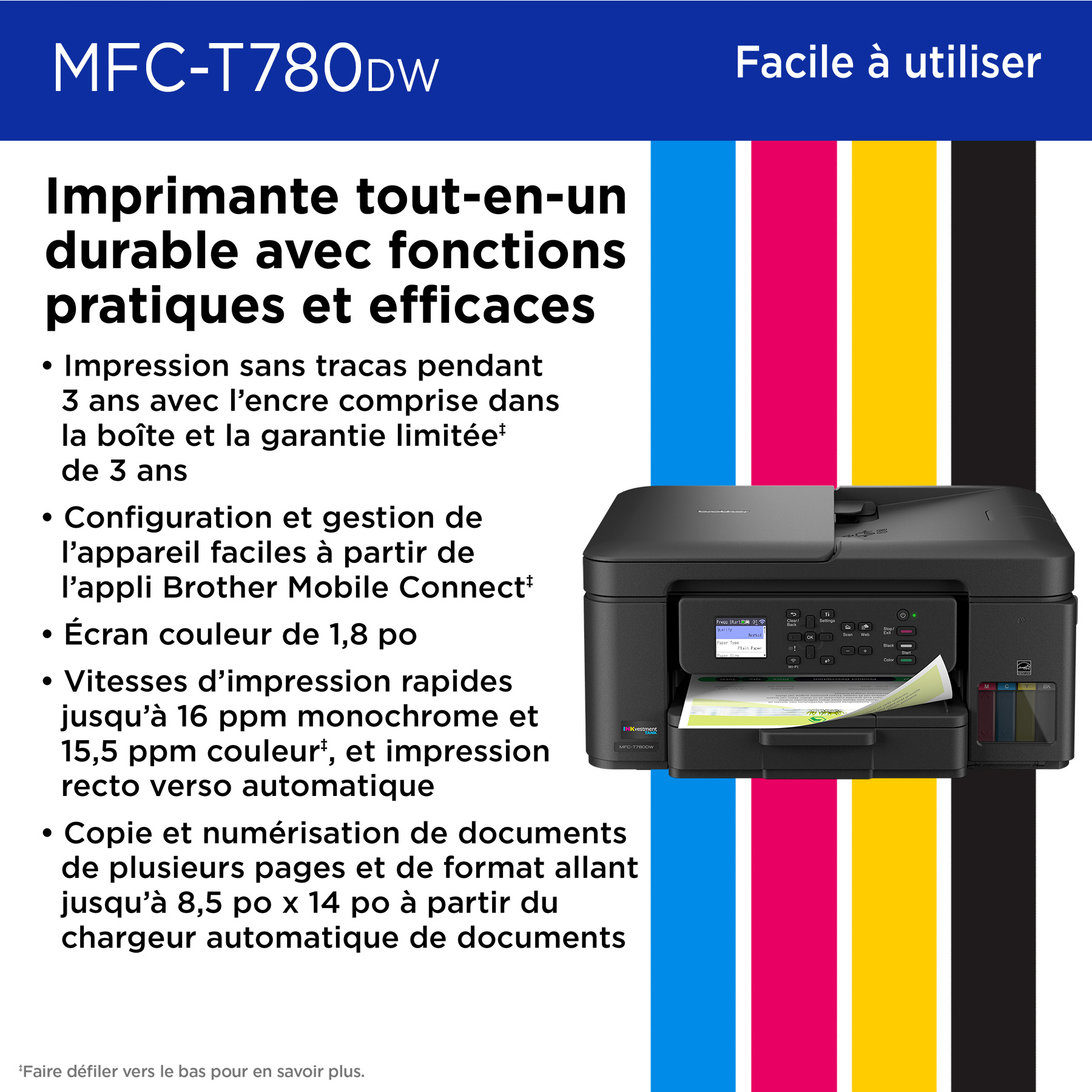L’imprimante tout-en-un à jet d’encre couleur sans fil INKvestment Tank MFC-T780DW de Brother, assortie de 3 ans d’encre(3), est dotée de la technologie de réservoir d’encre rechargeable de Brother et offre l’impression à distance avec l’appli Brother Mobile Connect(4). Voir la description complète du produit