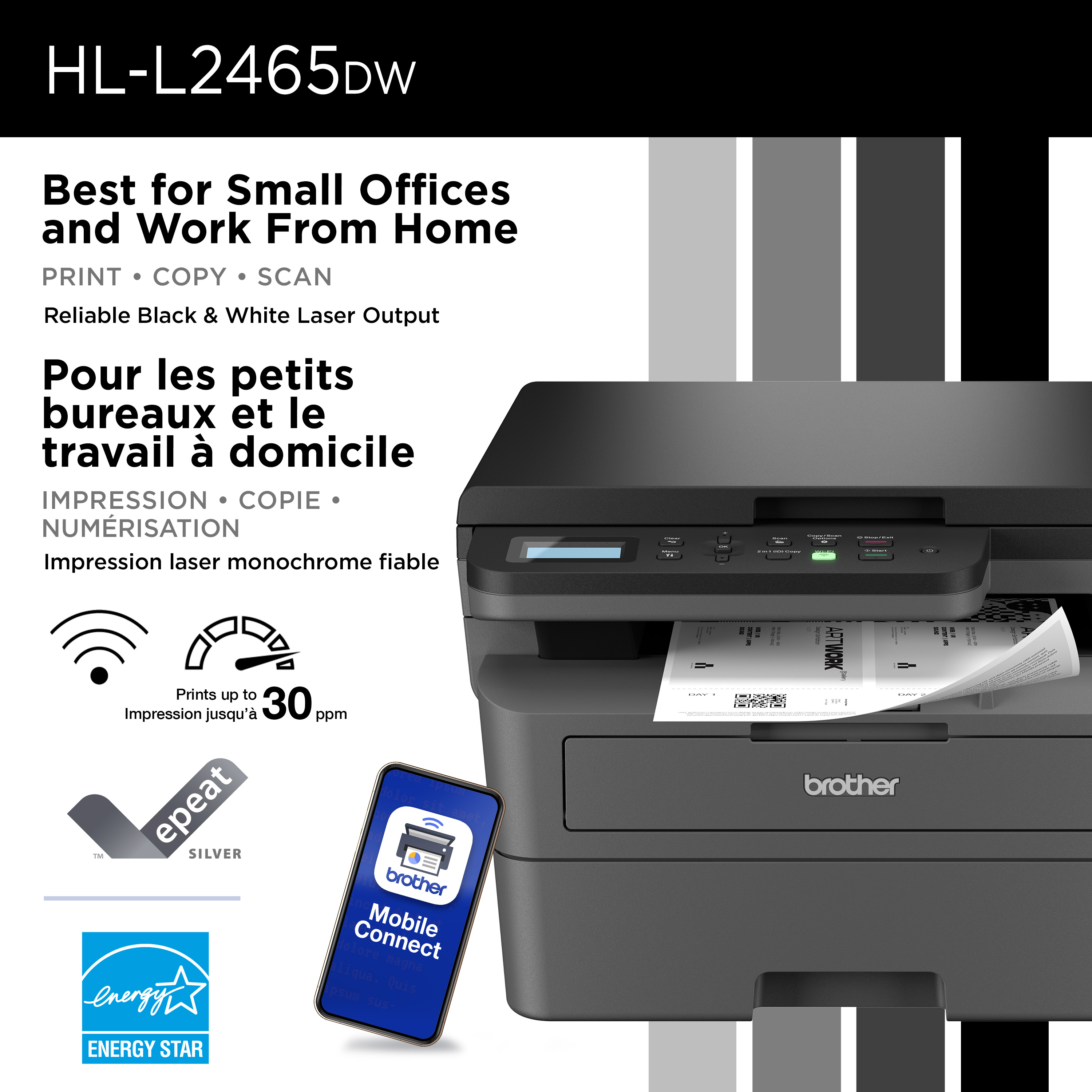 L’imprimante multifonction laser monochrome sans fil compacte HL-L2465DW de Brother regroupe des capacités d’impression, de copie et de numérisation dans un appareil efficace et abordable. Elle est un choix judicieux pour les environnements gérant des volumes élevés de documents. Cette imprimante offre l’impression recto verso automatique et produit des documents clairs et nets à des vitesses allant jusqu’à 30 ppm(1). Elle est équipée d’un bac à papier de 250 feuilles(2) et d’une vitre de numérisation à plat fort pratique pour copier et numériser des documents. Elle comprend des options de connexion flexibles, comme une interface sans fil bibande, un port USB 2.0 et l’application Brother Mobile Connect(3) qui vous permettent d’utiliser votre imprimante partout. Ses fonctions de sécurité avancées protègent votre appareil contre toute utilisation non autorisée et gardent les documents sensibles en sécurité. De plus, cette imprimante est compatible avec l’Abonnement Refresh, qui est à la fois pratique et économique. En vous abonnant à Refresh, vous pouvez économiser jusqu’à 50 % sur le toner(4), comme les cartouches de toner authentiques TN830 de Brother. De plus, les cartouches sont livrées directement à votre domicile, au bon moment. 1. Impression recto. Modification des paramètres par défaut requise. 2. Capacité maximale basée sur l’utilisation de papier 20 lb. 3. Application téléchargeable gratuitement et connexion à un réseau sans fil requises. La compatibilité peut varier selon le type d’appareil et le système d’exploitation. 4. Nécessite un abonnement mensuel payant au service Abonnement encre et toner Refresh de Brother en fonction du nombre de pages imprimées par mois. Pour en savoir plus sur l’Abonnement encre et toner et vous inscrire, visitez : https://www.brother.ca/fr/refresh.