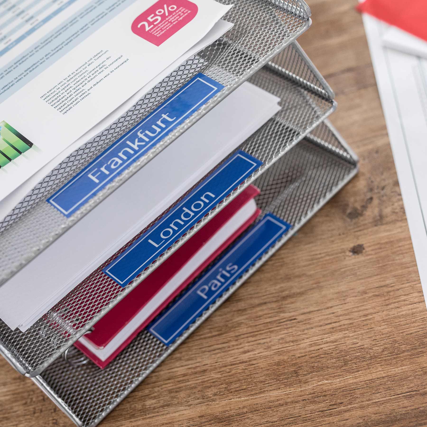 - Ruban laminé TZe bleu avec texte blanc de 18 mm