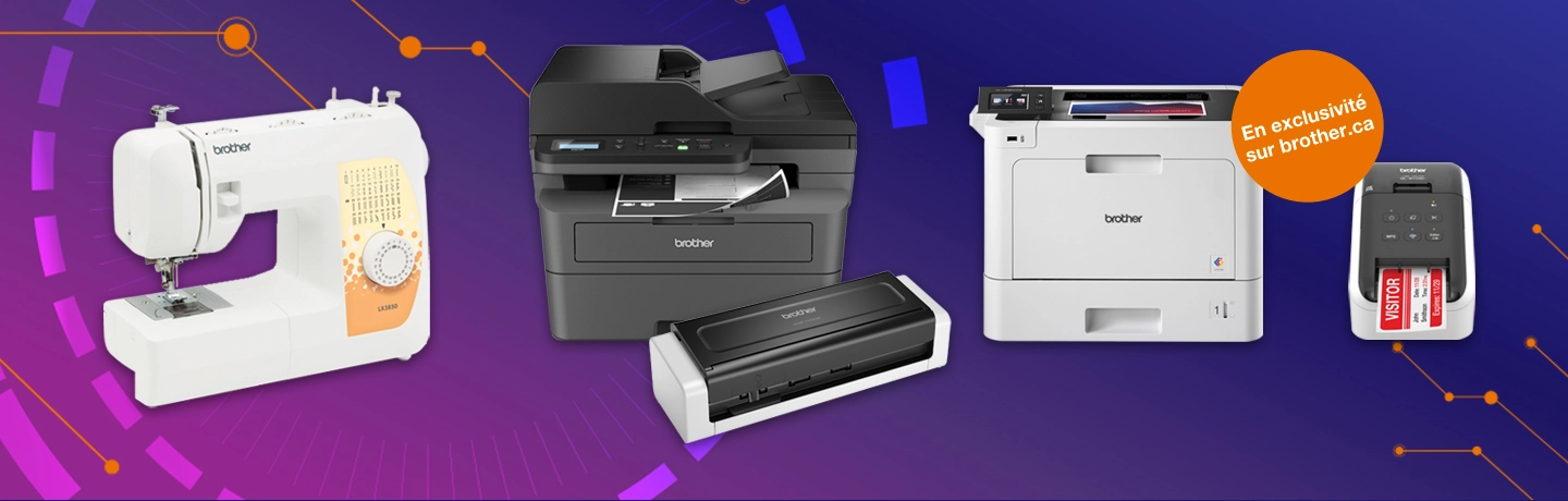 **La remise instantanée s'applique aux achats effectués sur Brother.ca jusqu'au 4 décembre2025, 23 h 59 (HE), ou jusqu'à épuisement des stocks. Aucun code promotionnel requis. Limite de 2 produits remis à neuf, de couture ou d'artisanat offerts à prix réduit par commande. Limite de 3 imprimantes, scanners, étiqueteuses ou imprimantes d'étiquettes offerts à prix réduit par commande. Cette offre n'est pas offerte aux distributeurs, revendeurs ou autres partenaires de distribution de Brother. Cette offre n'est pas valide au Nunavut, dans les Territoires du Nord-Ouest et au Yukon. Brother se réserve le droit de modifier cette offre ou d'y mettre fin à tout moment sans préavis. Cette offre est sans effet là où la loi l'interdit.